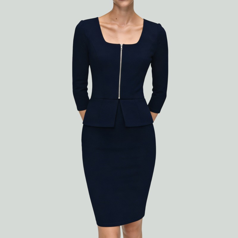 Silhouette: A slim-fitting pencil skirt silhouette paired with a natural waistline design creates a professional and polished profile.
