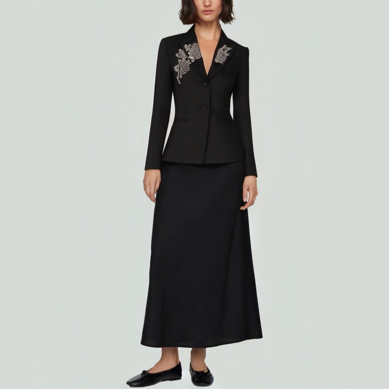 Design: Single-breasted V-neck design with beaded embroidery details on the bodice for added refinement.